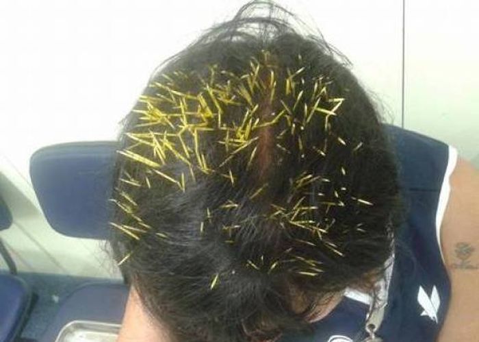 52-летняя Сандра Набукко (Sandra Nabucco) из Рио-де-Жанейро выгуливала собаку, когда ей на голову с фонарного столба упал дикобраз. Дикобраз к распространенному заблуждению иголками не стреляет, он оставляет их в теле жертвы. В больнице из кожи головы несчастной Сандры Набукко были извлечены 272 иглы дикобраза.