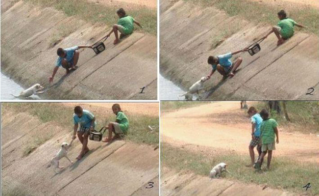 Эти фотография двух детей, помогающих друг-другу, чтобы спасти собаку, которая попала в ущелье.