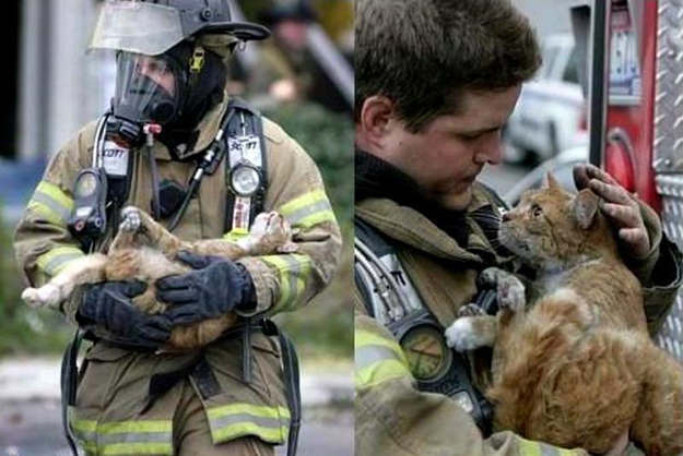 Спасатель пытается спасти кошку от удушья, после пережитого ею пожара.
