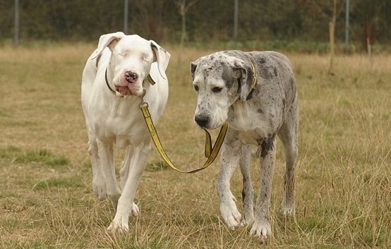 Собака по имени Лила была щенком, когда ей поставили диагноз - полное отсутствие зрения. Она в то время жила с датским догом, который взял ее под свое "крыло".Собаки до сих пор гуляют только вместе, а Лила ни на шаг не отходит от своего друга, дога по кличке Мэдисон.