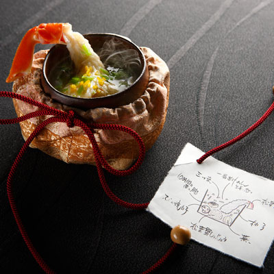 Среди изысканных блюд шеф-повара Сейджи Ямамото есть и это жаркое из снежного краба (которого специально привозят из района Таджима), морского уха, 10 часов подряд готовящегося на пару, и молоки фугу в имбирном даши-бульоне. Вместе с блюдом подается и рисунок, на котором показан весь процесс приготовления.