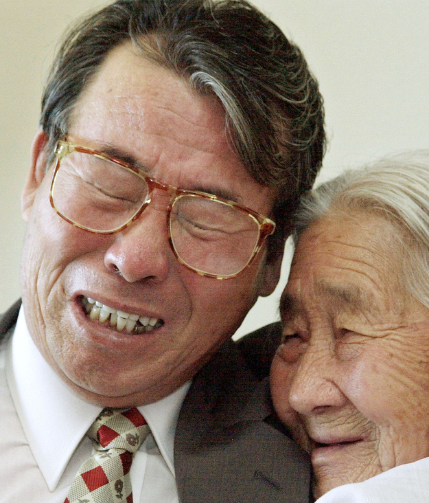 Житель Северной Кореи Со Ги Сок плачет от радости, обнимая свою мать из Южной Кореи Ким Кум-яй.