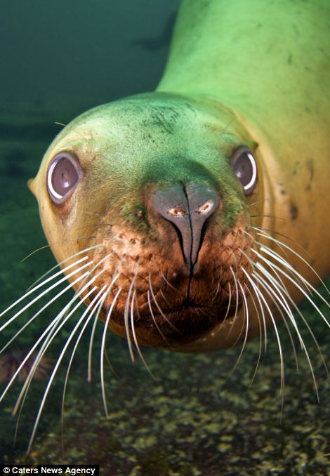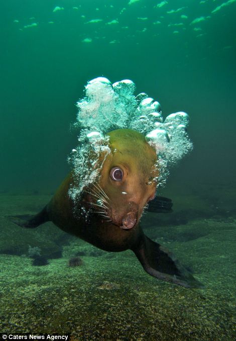 Морского льва «застукали» за игрой с собственным отражением. Стая морских львов окружила подводного фотографа Джона Корнфорта у берегов острова Хорнби в Канаде, и один из них заинтересовался собственным отражением в объективе фотоаппарата.