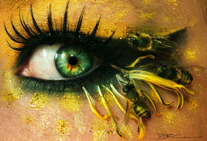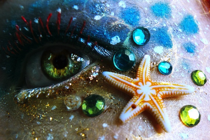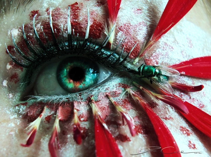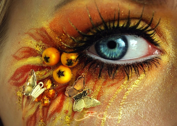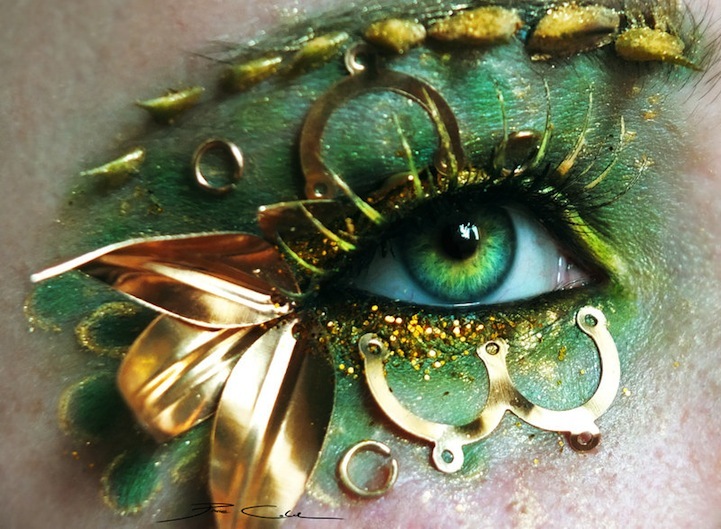 Немецкая художница Свения Шмитт посвятила серию работ художественному макияжу, но не всего лица, а исключительно глазам. В своей работе она использует не только краски, блеск и стразы, но также лепестки цветов, птичьи перья, насекомых и даже улиток. Фантазия автора переносится с цветочной поляны в берлогу хищника и опускается на морское дно.