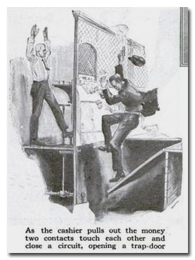 Люк располагался прямо перед окошком кассы банка. В случае ограбления кассиру всего-то и нужно было – нажать ногой специальный рычаг в полу. Люк открывался, и грабитель проваливался в специальное помещение, где и дожидался приезда полиции. Это если кассир попадётся добрый. Потому что для верности по правую руку сотрудника банка был ещё и вентиль, открутив который можно было пустить воду в ловушку с особенно опасным преступником. И тогда работы у полиции оказывалось значительно меньше.