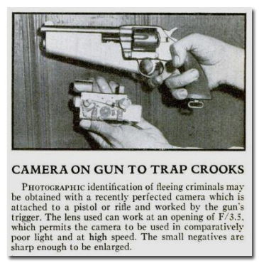 Это устройство придумано для полицейских-мазил. Если пристрелить преступника не удается и он сбегает, то, по крайней мере, остаётся хоть его свежая фотография. Камера автоматически срабатывает, когда полицейский нажимает на спусковой крючок.
