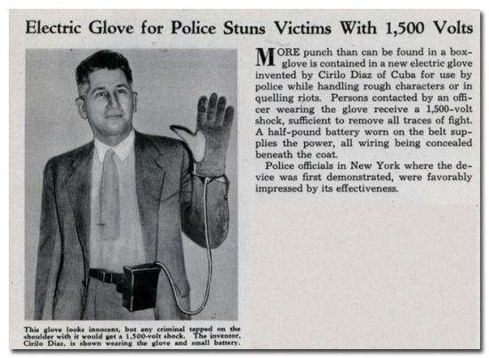 Это изобретение кубинца Сирлио Диаса, должно было усмирять уличных протестантов. Человек, вступивший в схватку со служителем закона в такой перчатке, получал электрический разряд в 1 500 вольт. Одного лёгкого прикосновения было достаточно, чтобы утихомирить любого недовольного.