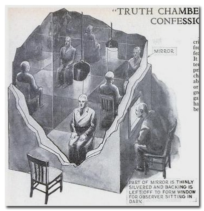 Давным-давно, когда схема с хорошим и плохим следователем не была ещё отработана, криминологи Нью-Йорка создали проект под названием «Комната правды». Это было крохотное помещение, все стены которого были покрыты зеркалами. Куда бы подозреваемый ни смотрел, он всюду видел бесконечные отражения своей виновной физиономии. Источник света, размещённый над головой во время допроса, мог регулироваться таким образом, чтобы лицо допрашиваемого выглядело ещё несчастнее и изнурённее. Через пару часов допроса такой в комнате любой подозреваемый начинал каяться.