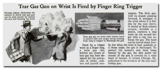 В конце 20-х – начале 30-х годов прошлого века слезоточивый газ был в большой чести. Какие только его модификации ни изобретались, подо что только ни маскировались. Особой популярностью пользовалась модель, надевавшаяся на запястье и приводившаяся в действие при помощи кольца на пальце. Достаточно согнуть запястье особым образом и облако чистого страдания обволакивает вашего собеседника.