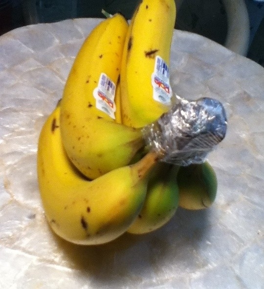 Оберните ножку бананов пищевой пленкой, так они продержатся на 3-5 дней дольше. Также, бананы выделяют больше этилена, так что храните их подальше от других овощей и фруктов.