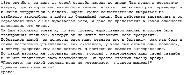 Ничто не может помешать моей свадьбе! жесть жизнь люди свадьба 27.10.2012 486 Удивительная история о невероятной силе воли! Обязательно читаем далее про случай, который произошел за день до свадьбы. Поделиться в соц. сетях