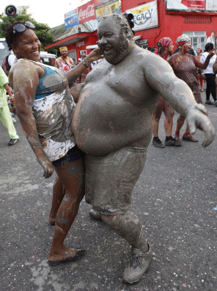 Измазанные грязью люди танцуют на улице, празднуя начало карнавала «Trinidad and Tobago Carnival» в городе Порт-оф-Спейн, Тринидад и Тобаго.