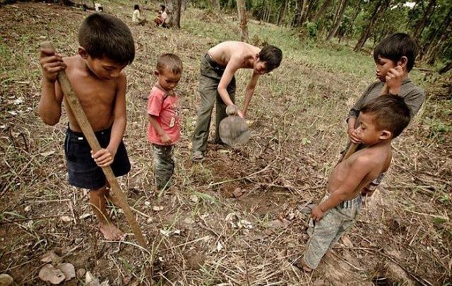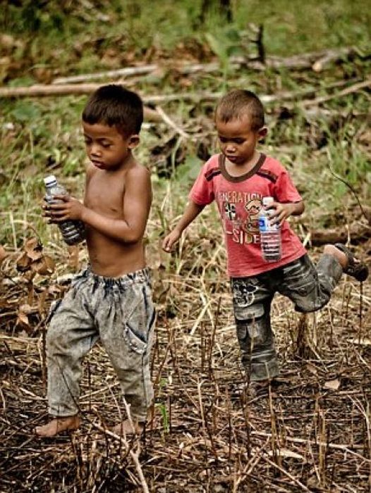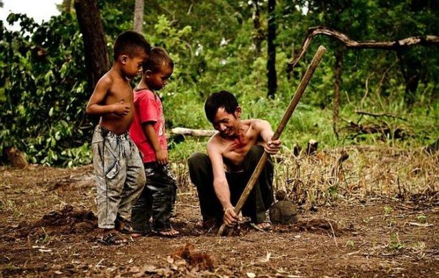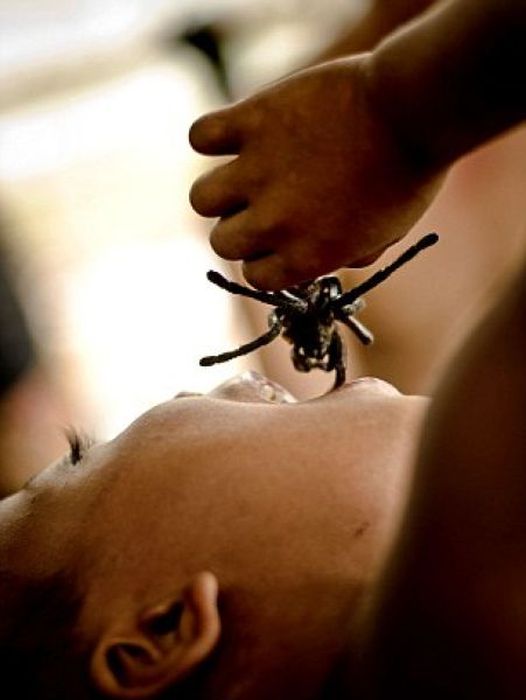 Детишки из Камбоджи ловят тарантулов, после чего кидают их в бутылку с водой и маслом, и жарят их на костре. А таким образом получается уникальный местный хрустящий десерт.