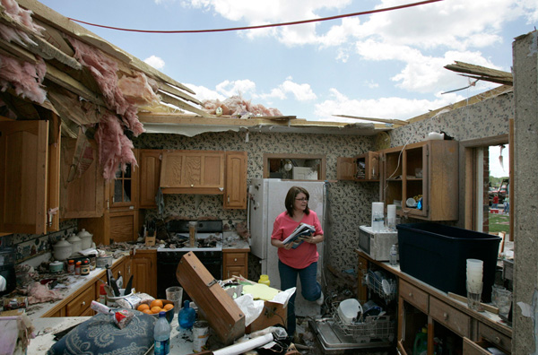 Дарлин Шини стоит посреди своей разрушенной торнадо кухни