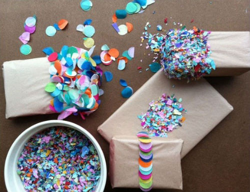 Можно нанести клей на обычную бумагу и посыпать ее конфетти.