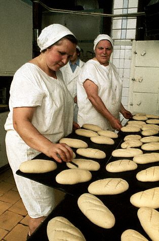 1975-й год. Хлебозавод. Я чувствовал, что надрезы на батонах делали руками (сейчас уже робот напиливает)