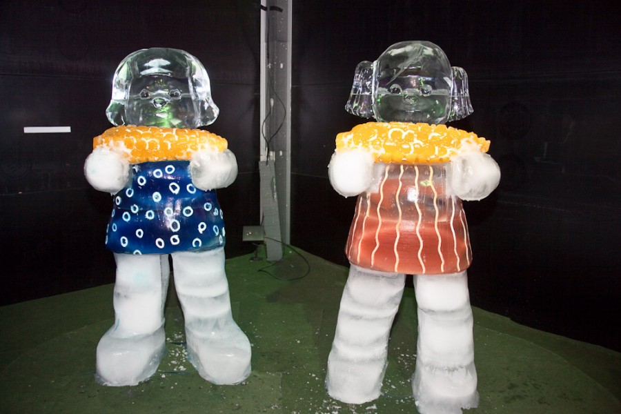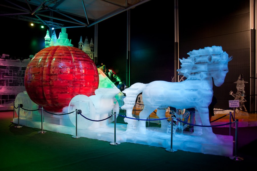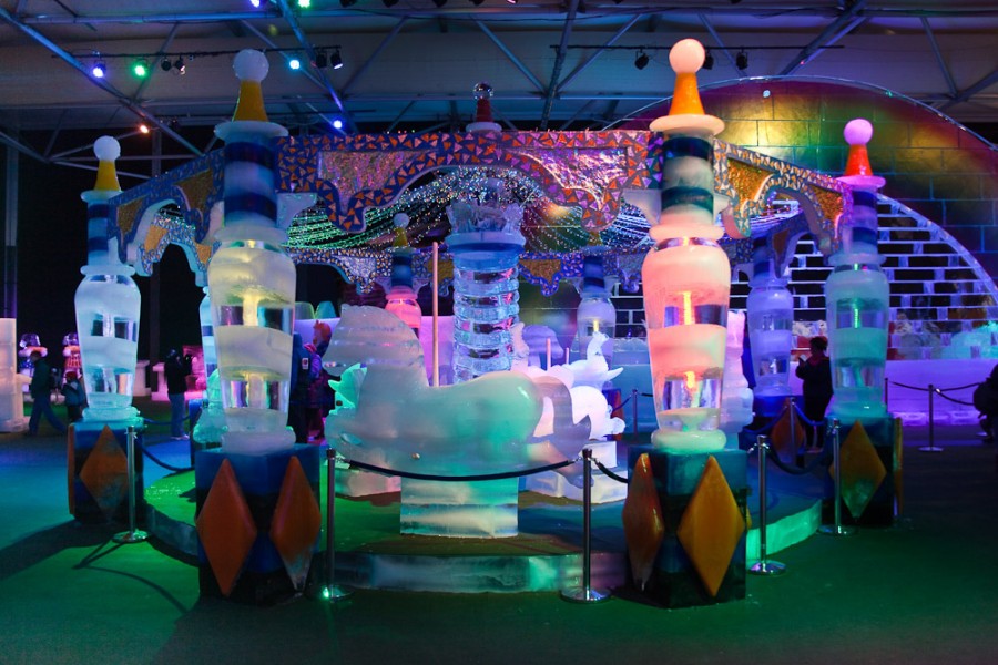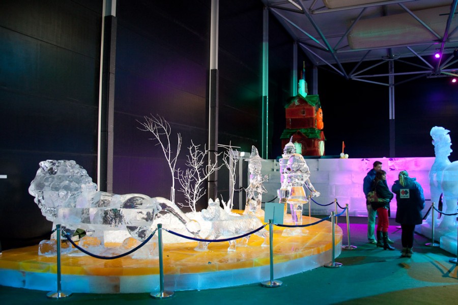 Выставка ледянных скульптур представляет собой огромный павильон, разделенный на несколько секторов. Температура там около -10, поэтому организаторы раздают теплые куртки на входе. Кстати, советую отнестись к этому серьезно, так как там действительно холодно. Около выставки есть и каток, но вход туда отдельный. Павильон, кстати, не такой большой, как кажется)) Мне почему-то казалось, что он больше. Обойти его весь можно минут за 20.