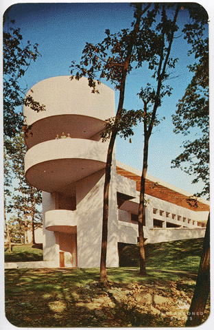 На этой открытке концертного зала из Поконоса есть надпись, которая гласит: "Самое современное в мире курортное место для шоу"