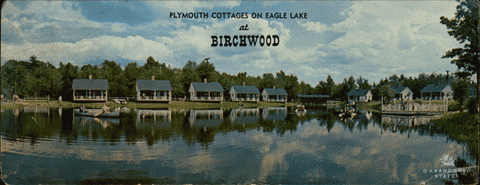 Заголовок открытки: "Birchwood — единственный курорт, предлагающий три бассейна: крытый бассейн, открытый бассейн и озеро с пляжем. На снимке — красивое Орлиное озеро, у подножия деревни Грин"