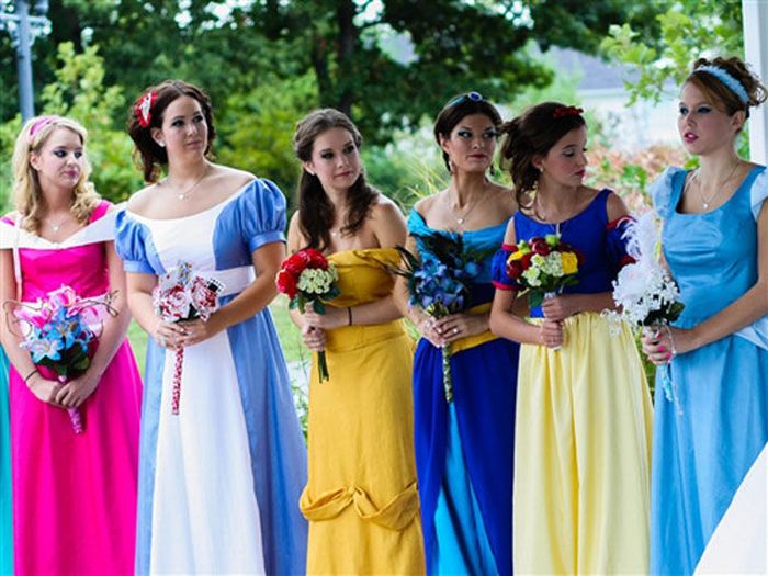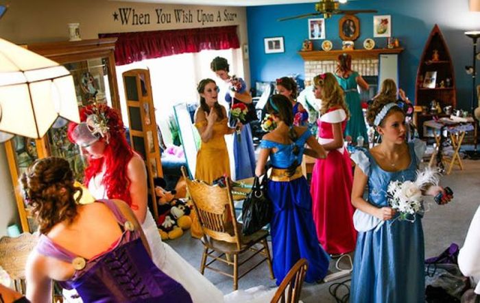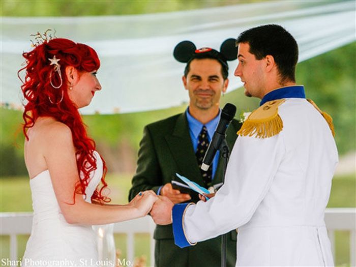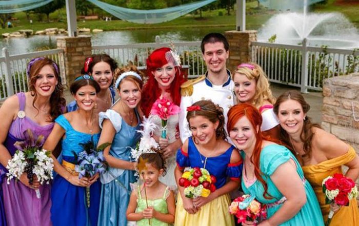 Принцесса Ариэль и принц Эрик - не ожившие персонажи из мультфильма, а всего лишь креативные молодожены, которые решили сделать свою свадьбу в стиле Диснея. Джейми и Кристофер, как зовут их в реальной жизнь, настолько любят все, что связано с Диснеем, что даже предложение жених сделал необычным способом: став на колено, он презентовал девушке хрустальную туфельку, в которой было обручальное кольцо.
