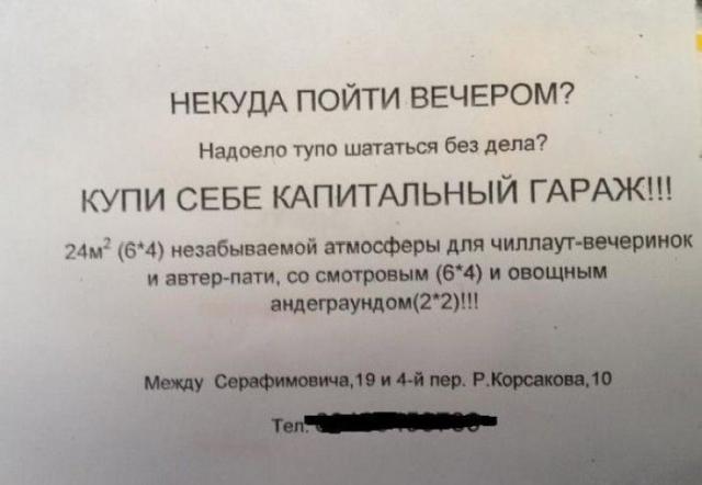 Смешные объявления от русских креативщиков Смешное Картинки с надписями креатив люди 16.02.2013 697 Порция позитива в подборке народного креатива, который можно встретить в каждом городе нашей страны. Поделиться в соц. сетях