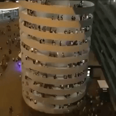 Люди, покидающие футбольный стадион Сан-Сиро в Милане, создают эффект, что вся спираль вращается