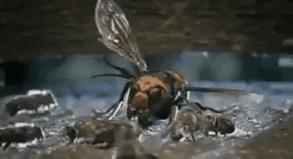 Попытка шершня напасть на пчелу в пчелином улье