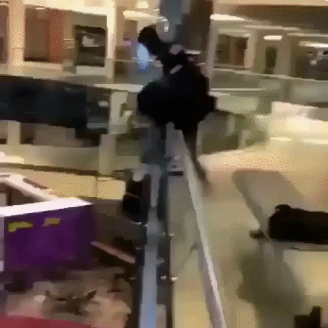 Подростки хулиганят в торговом центре. Один из них решил спрыгнуть на тонкий пластик