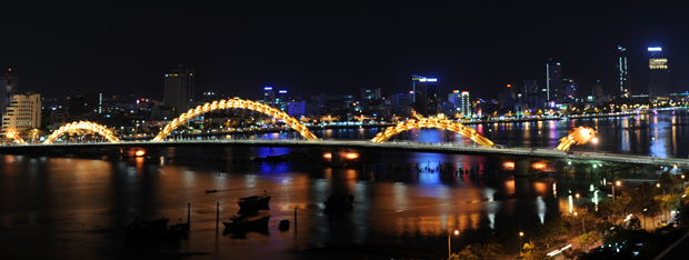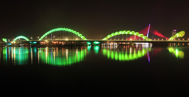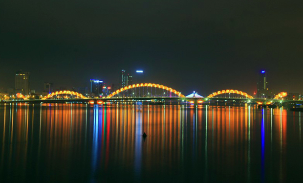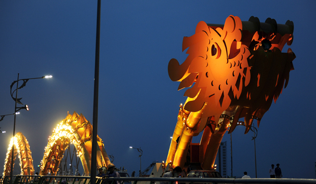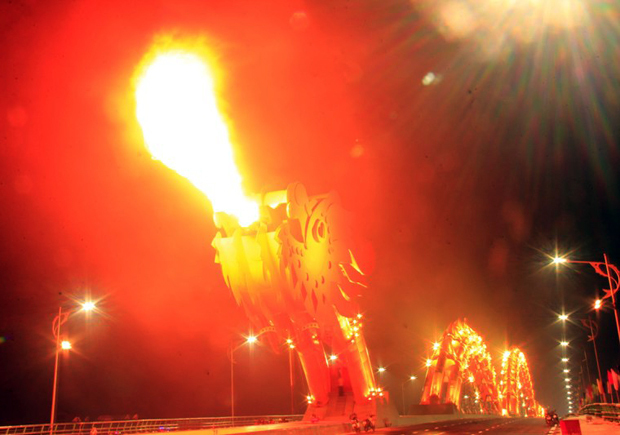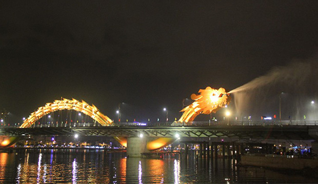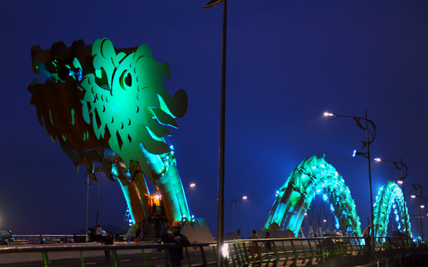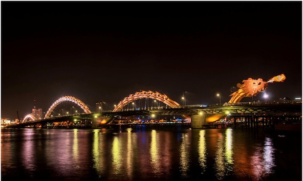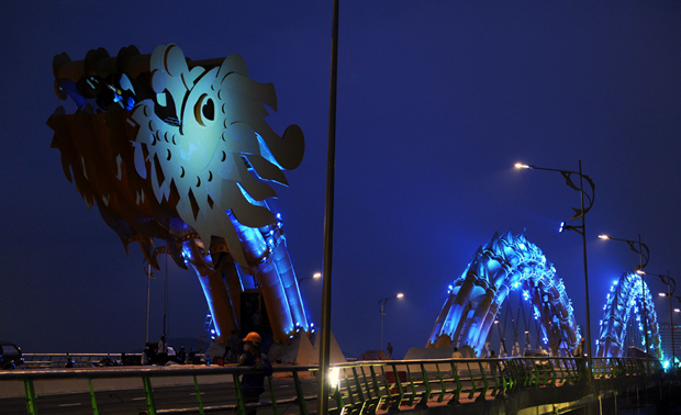 В главном портовом городе Вьетнама - в Дананге открыли мост Дракона! Необычайное зрелище! Гигантская фигура дракона длинной 666 метров, обвивающая весь мост! Особенно мост выглядит крайне впечатляюще в ночное время, он меняет цвет, что обеспечивают 15000 светодиодных ламп и изрыгает настоящее пламя, также он может плеваться водой.