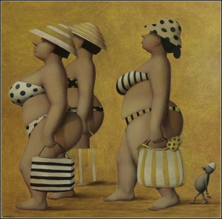Французская художница Жанна Лорио родилась в 1954 году, училась в Школе искусств в Париже. В своих восхитительных работах художница откровенно смеется над "журнальной" красотой, захватывая свои великолепные, гротескные женские фигуры в моменты созерцательности, принятия ванны, танца или отдыха иногда с несколько преуменьшенными их мужчинами.