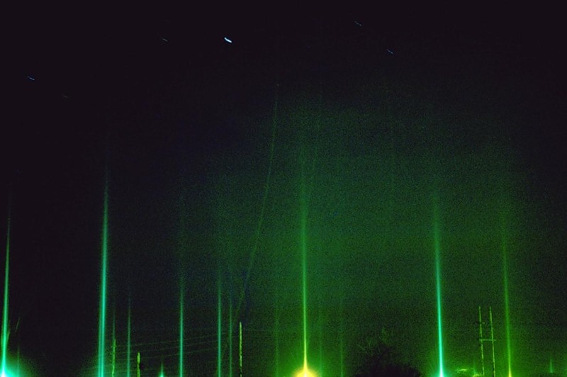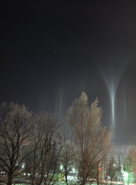 Световые столбы выглядят как узкие вертикальные колонны, поднимающиеся высоко вверх либо опускающиеся вниз от источника света (особенно если этот оптический эффект происходит в ночные часы и вызван воздействием искусственного света).