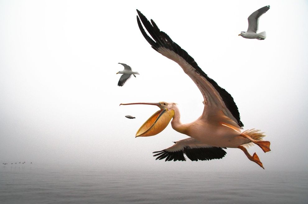 Ромуло Рейон: «Я был в морском круизе в Валвис Бэй, Намибия. Наблюдал за дельфинами, тюленями, луна-рыбами, бакланами, и даже не думал о том, чтобы фотографировать. Но затем капитан бросил кусок рыбы с лодки, и мне повезло сфотографировать этого пеликана как раз в тот момент, когда он ловил его».