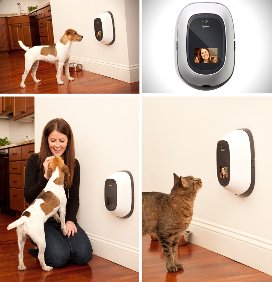 Американская фирма PetChatz утверждает, что выпустили первый видеотелефон в мире для кошек и собак. Это цветная камера, которая может также записывать клипы по сети Wi-Fi. Устройство также «раздает» лакомства и испускает успокаивающие ароматы. Владельцы могут войти на сайт PetChatz.com на своем компьютере или через телефонное приложение, чтобы «поговорить». И особый звонок сообщает домашним животным, что звонит хозяин. Так их можно приучить к видео-телефону. Компания PetChatz располагается в Миннесоте. По их словам это «веселый сенсорный опыт» Компания также говорит: «Будьте с вашим питомцем везде и круглосуточно. В минуты, когда вы особенно заскучаете по своему любимцу, просто включите ваш компьютер, планшет или смартфон. Они вас видят, слышат, чувствуют вашу любовь с помощью вкусных угощений и успокаивающих ароматов. Ваш день становится немного легче; время, когда вы далеко друг от друга пролетает быстрее».