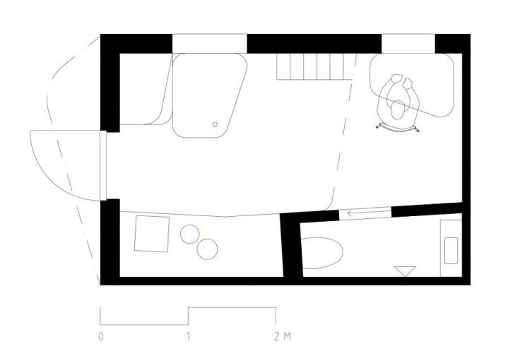 В нем находится спальня по лестнице вверх, кухня и туалет и рабочее пространство