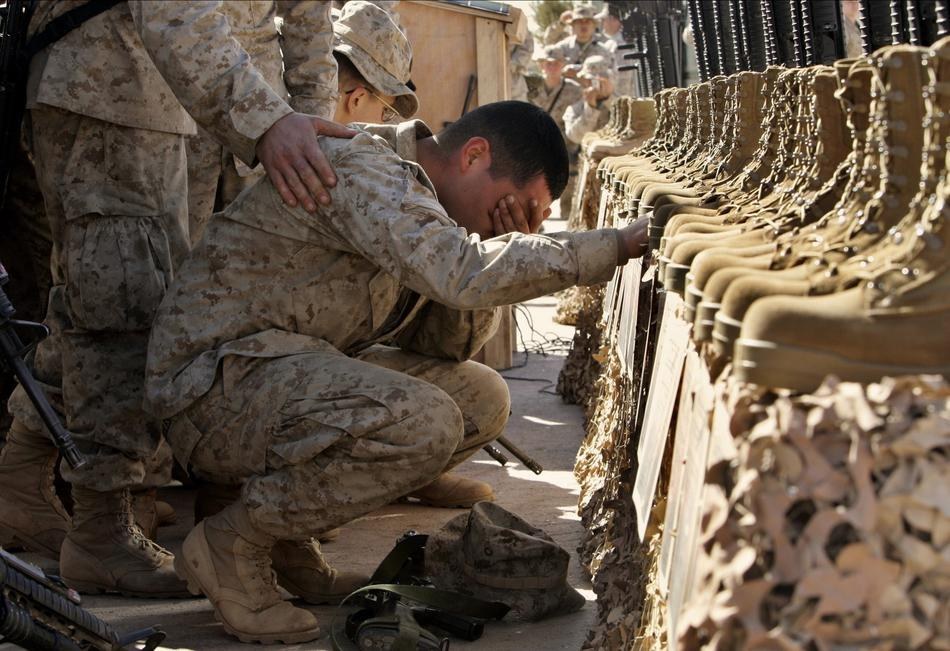 Американский морской пехотинец плачет на заупокойной службе по 31 убитому служащему в западном Ираке, 2 февраля 2005 года