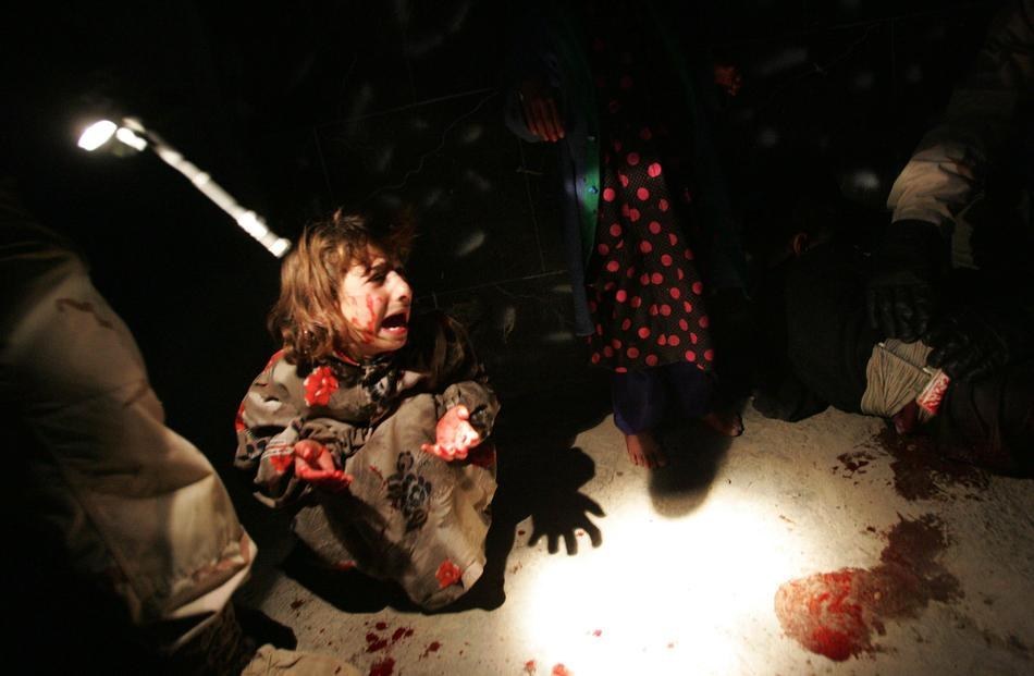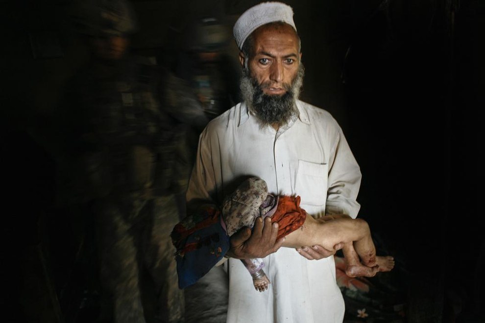 Афганский крестьянин выносит раненного ребенка из дома, 2007 год