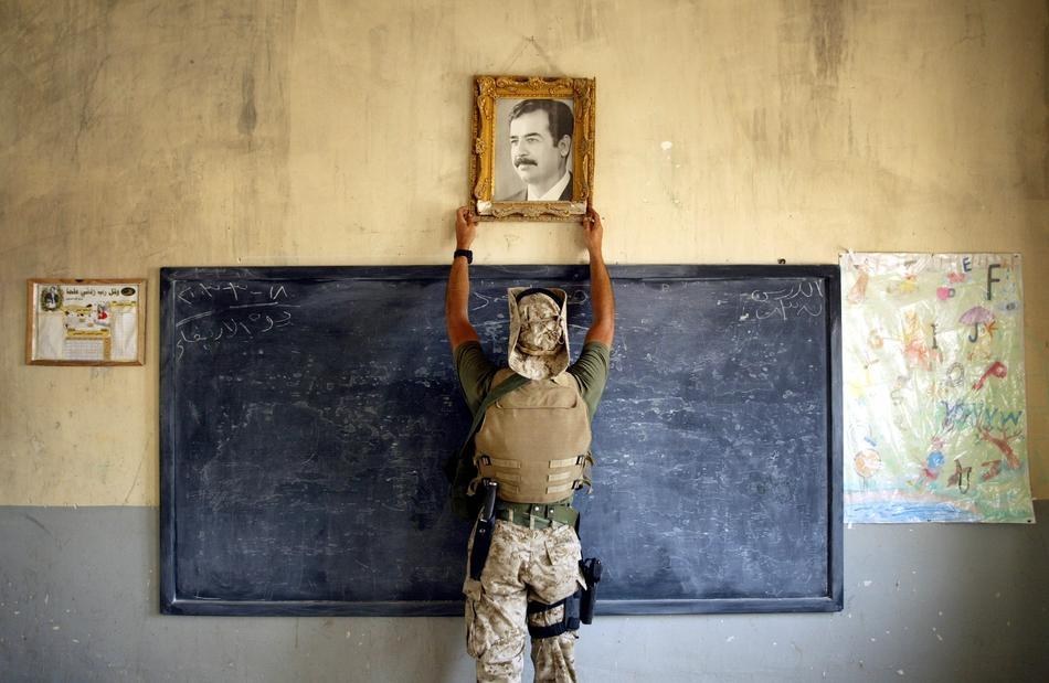 Американский морской пехотинец выкидывает портрет Саддама Хуссейна из окна захваченной иракской школы 16 апреля 2003 года