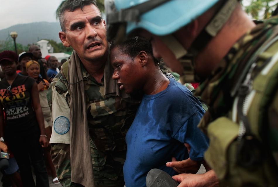 Миротворцы ООН из Уругвая помогают беременной гаитянке, потерявшей сознание в давке за благотворительным рисом, раздаваемым после землетрясения на Гаити. 25 января 2010 года