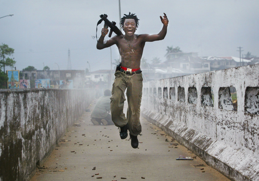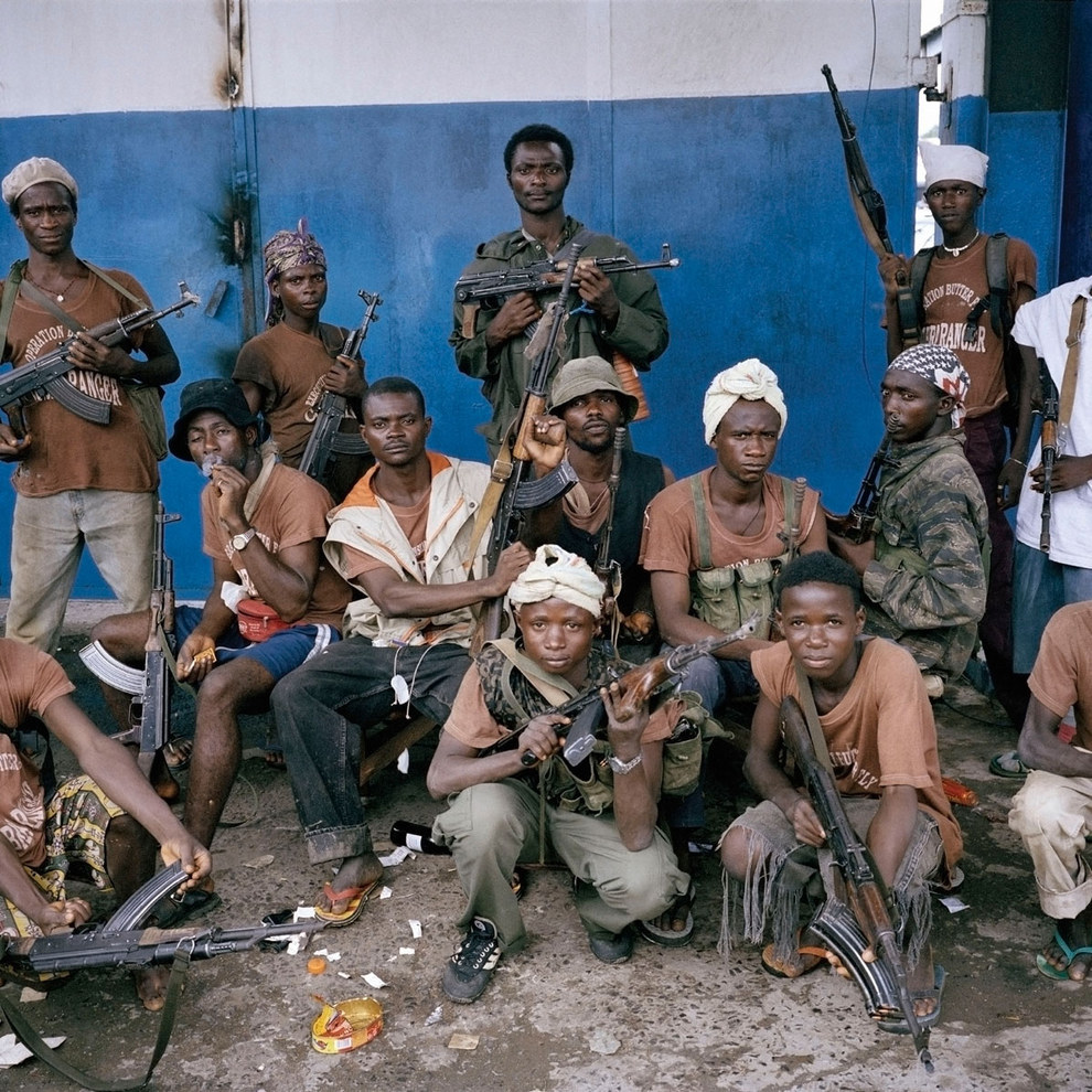 Бойцы позируют перед камерой в Либерии, 25 июня 2003 года