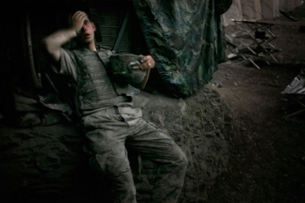 Солдат отдыхает в конце дня на блокпосту в Афганистане, 2007 год