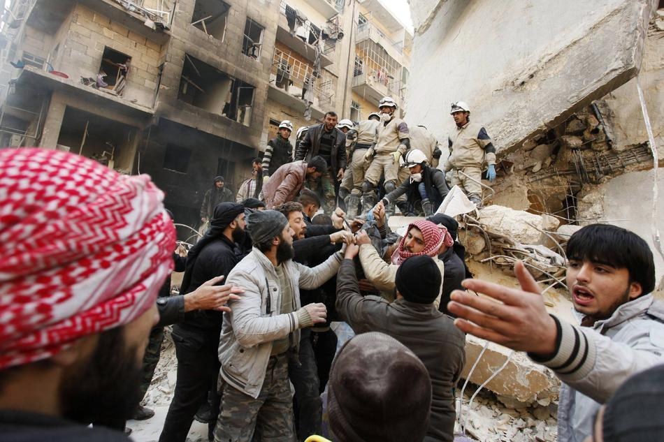 Сирийские восставшие убирают тело погибшего после авианалета (предположительно, совершенного авиацией правительства), 17 декабря 2013 года