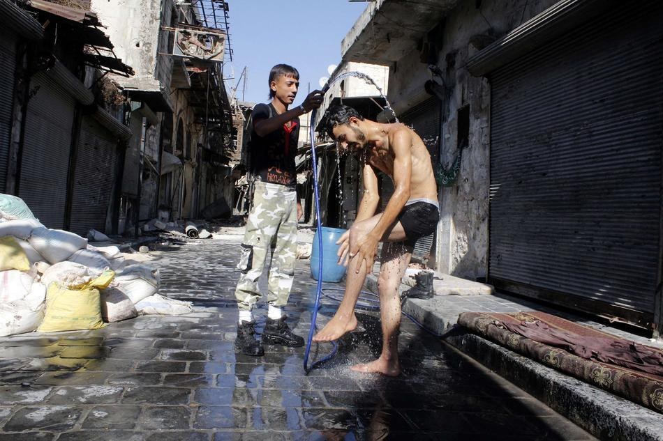 Боец Сирийской свободной армии принимает душ в старом городе в Алеппо, 1 сентября 2013 года