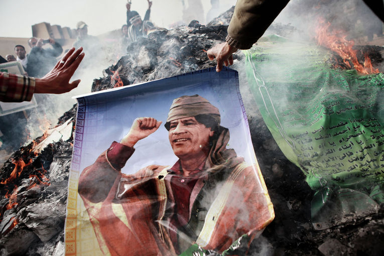 Житель Бенгази сжигает портрет Муамара Каддафи