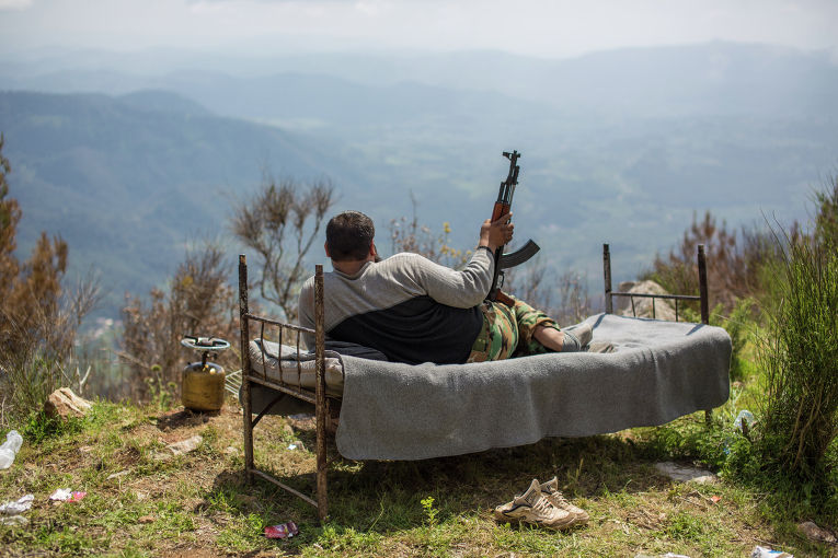 Сирийский солдат лежит на кровати на господствующей высоте у города Кесаб