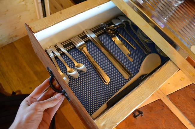 Каждый миллиметр пространства грузовика Майк пытался использовать по максимуму. Вот даже вилки и ложки лежат на своих местах, закрепленные магнитными полосами