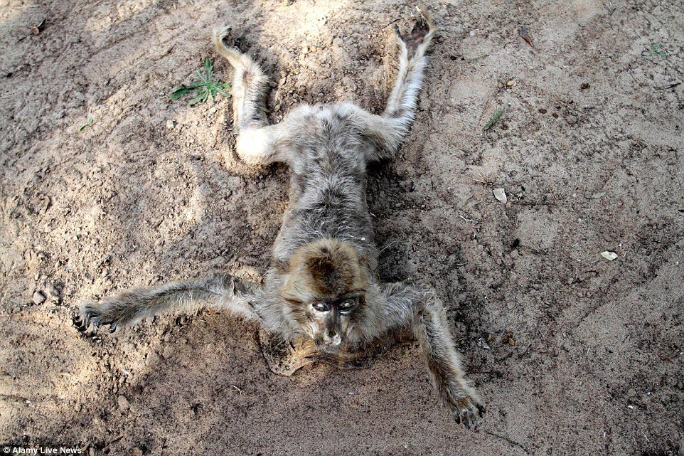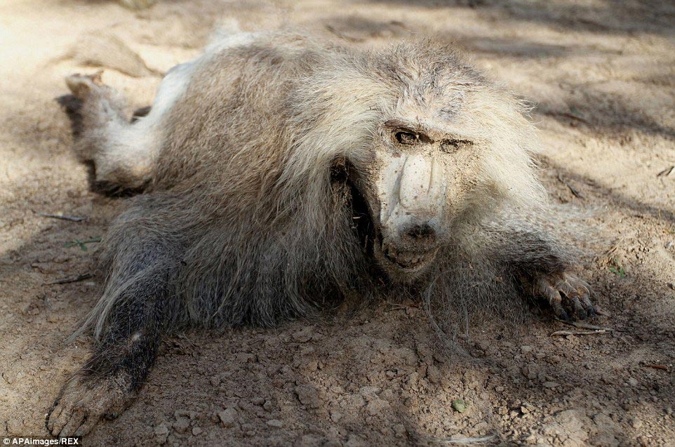 Мумифицированный труп павиана лежит в вольере, в окружении тел других обезьян, которые также умерли в зоопарке Хан-Юнис