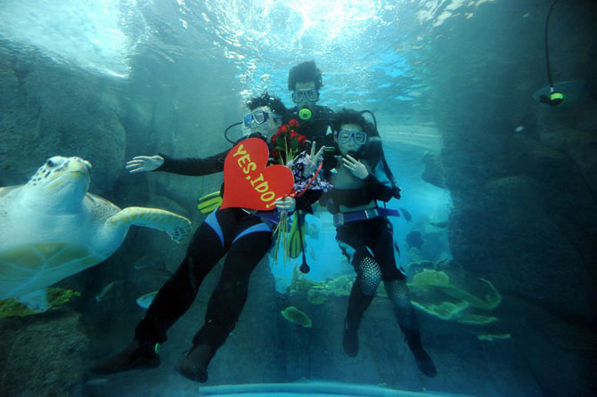 Китаец показывает табличку «Согласен» во время предложения руки и сердца своей девушке под водой в аквариуме Хэфея.