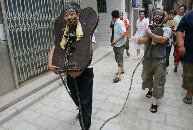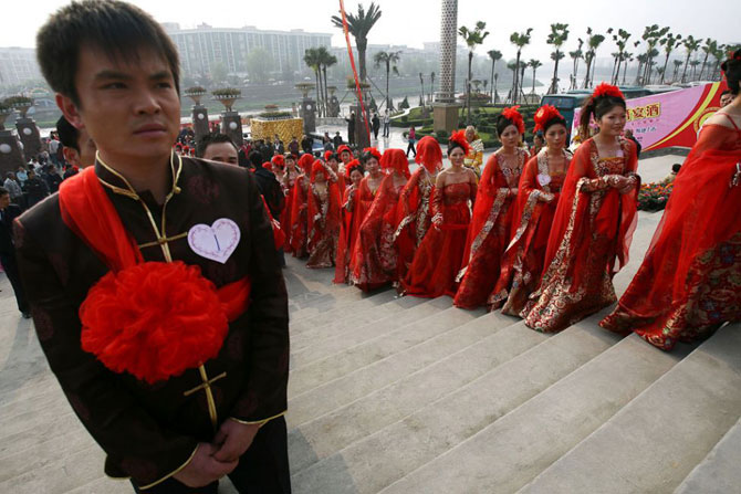 Жених (слева) и его свидетель идут с грязными лицами и с кандалами на шеях за невестой во время церемонии бракосочетания в китайской провинции Шааньси. Во время церемонии друзья и родственники жениха мажут его и его шафера кремом для обуви и надевают на шею замок, как бы говоря, что жених «связан узами брака».