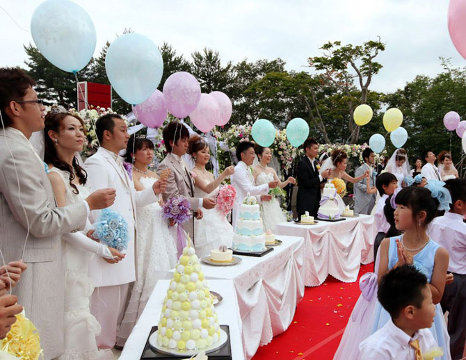 Десять пар, отложившие свои свадьбы из-за землетрясения и цунами в Японии, наконец, смогли пожениться в Камаиси, префектура Ивате.