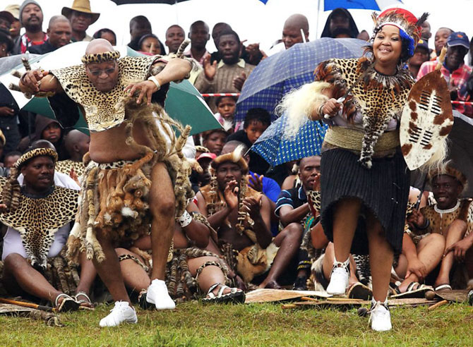 Президент Южной Африки Джейкоб Зума поет и танцует со своей новой женой Тобекой Мадибой на церемонии бракосочетания в ярких свадебных костюмах в поселке Нкандла.